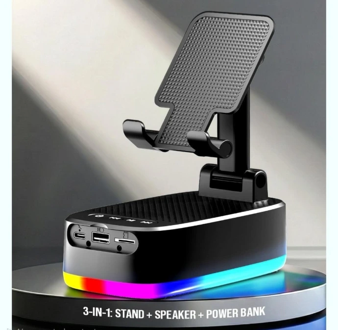 PRESENTING SOUNDBANK WITH 5W OUTPUT, 2500 MAH POWERBANK WITH UNIQUE DESIGN STAND AND ALSO WITH RGB LIGHT.